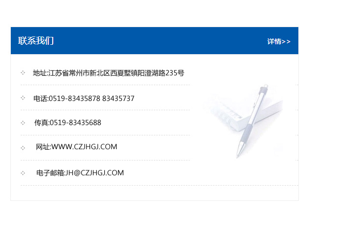 地址:常州市新北區友邦商務大廈1幢16、17層  電話:0519-85101652  傳真:0519-85112595  郵編:213022  網址:www_cz-jiayue_cn.ysfykj.com  郵箱:xiajifengaa@163.com